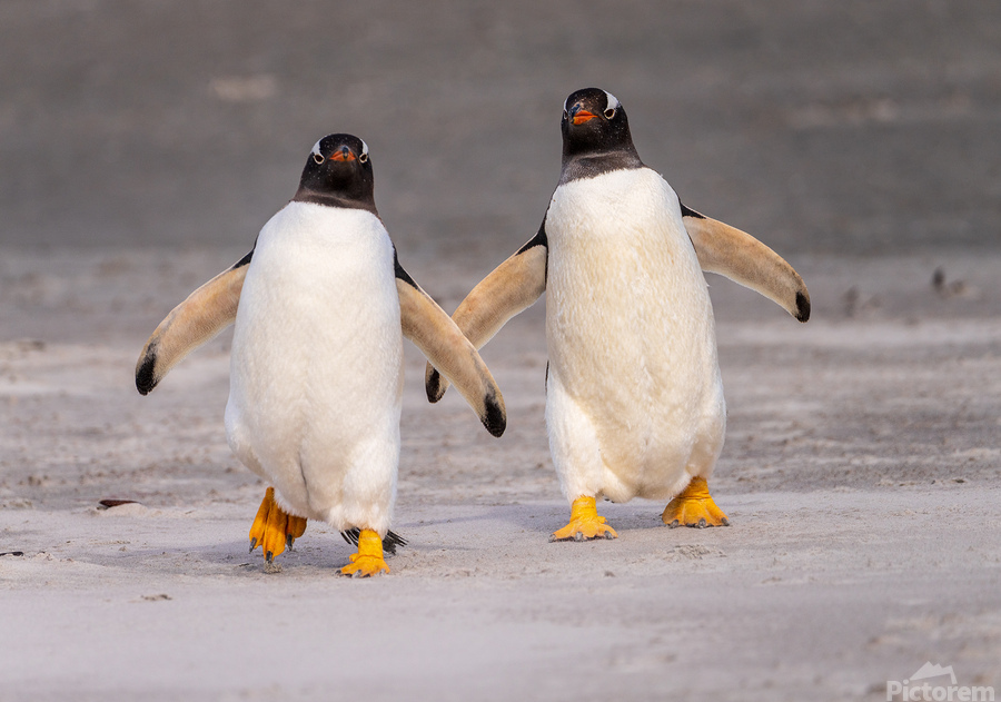 ABOUT THIS ARTWORK: TWO GENTOO PENGUINS AT BLUFF COVE ON FALKLANDS WALKING TO OCEAN
