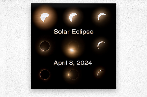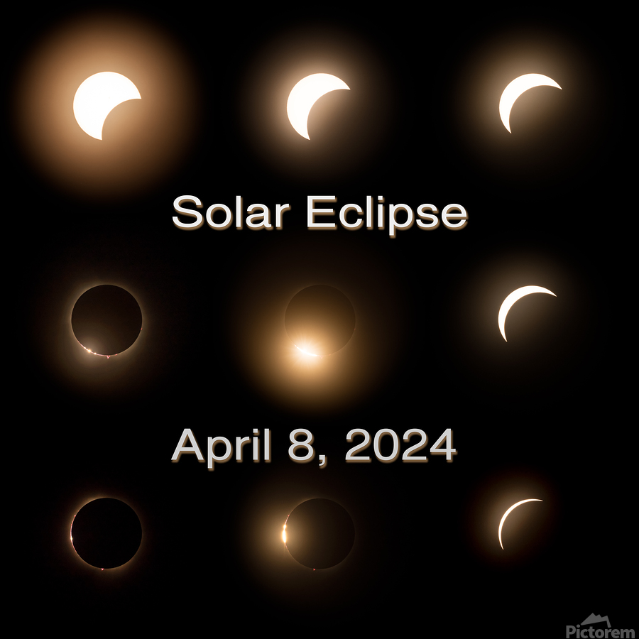 Composite of nine HD images of the solar eclipse in 2024 from start through total eclipse to the beginning of the uncovering of the sun with the Bailys Beads looking like a diamond ring with a title of Solar Eclipse and the date in April 2024