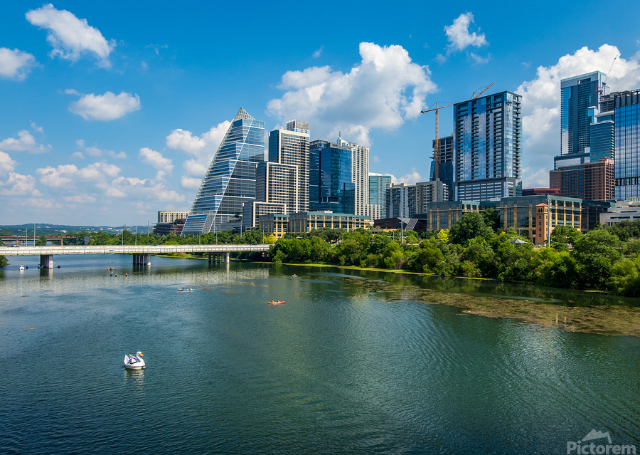 Get this artwork "Office Towers View - Austin cityscape across Lady Bird Lake" in a framed print.