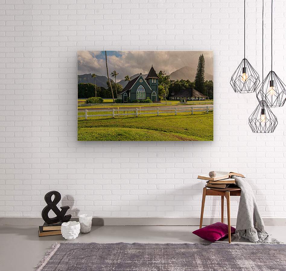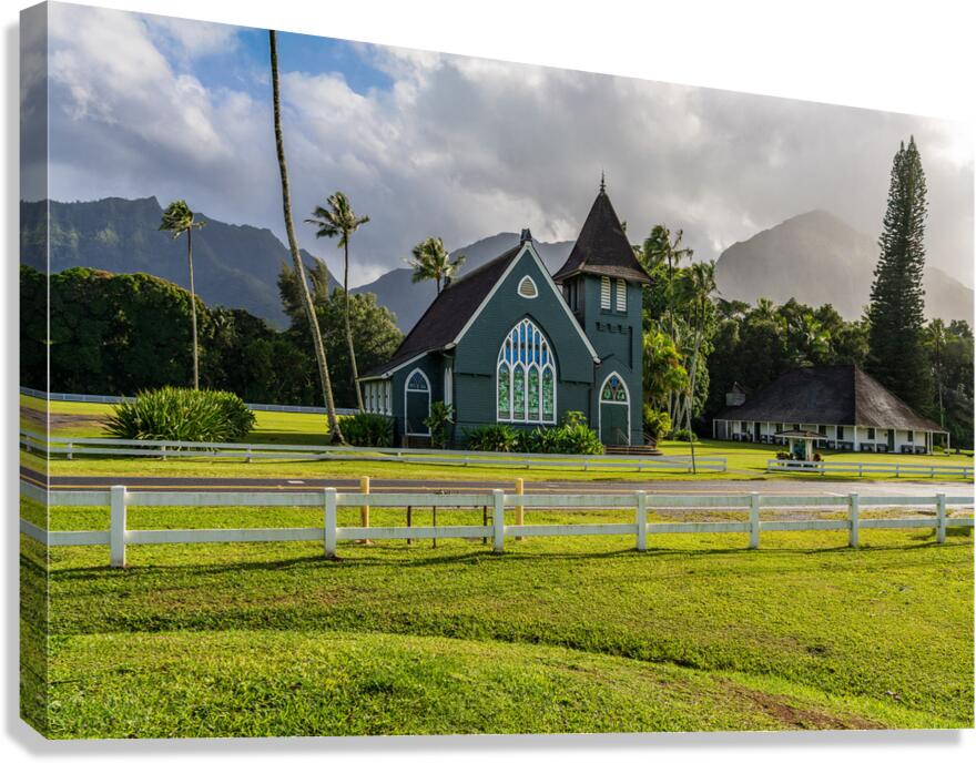 Get this artwork "Waioli Huiia Church stands in Hanalei Kauai with the majestic " in a framed print.