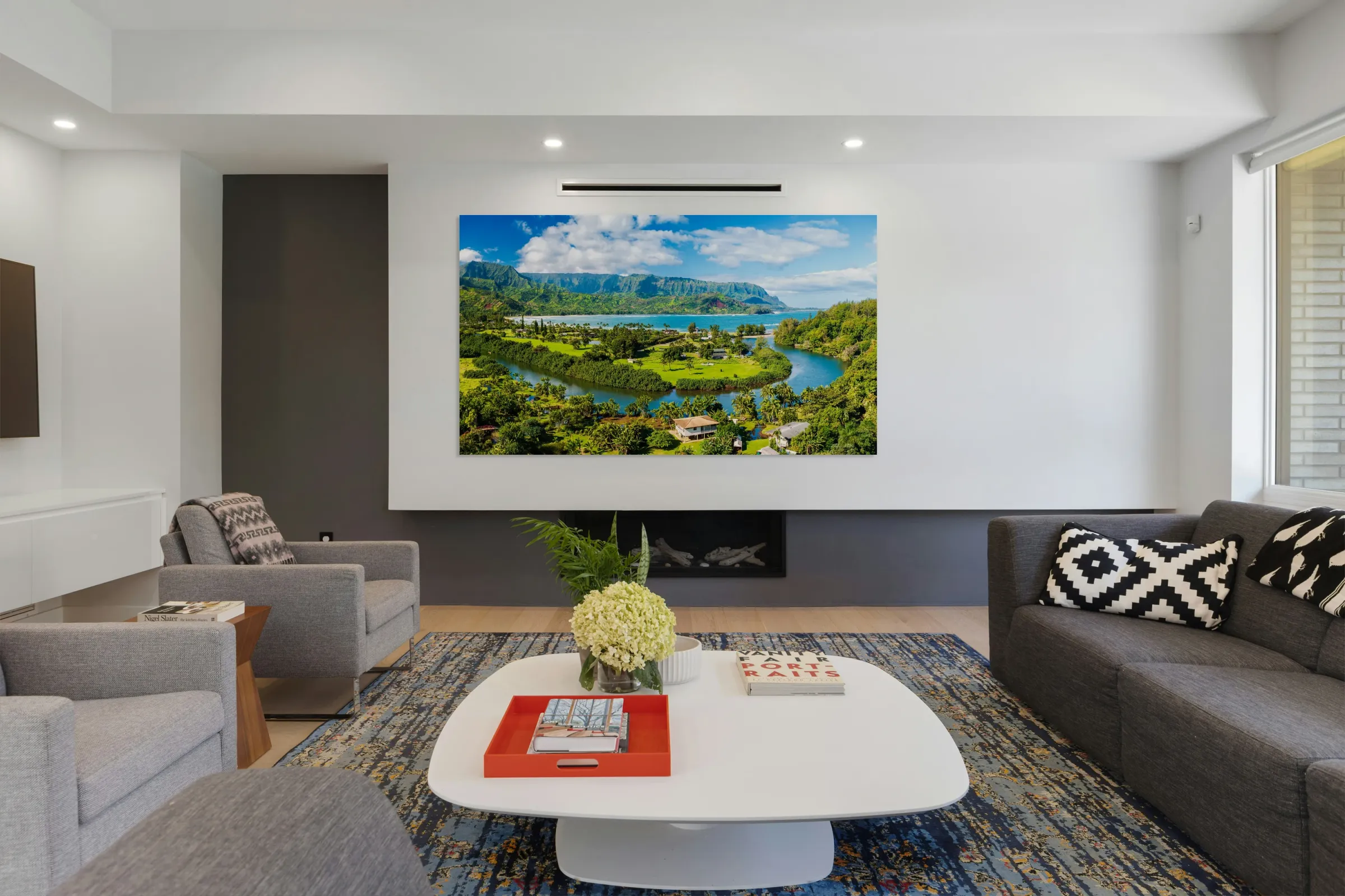Get this artwork "Aerial view of Hanalei Bays verdant landscape blue sky" in a framed print.