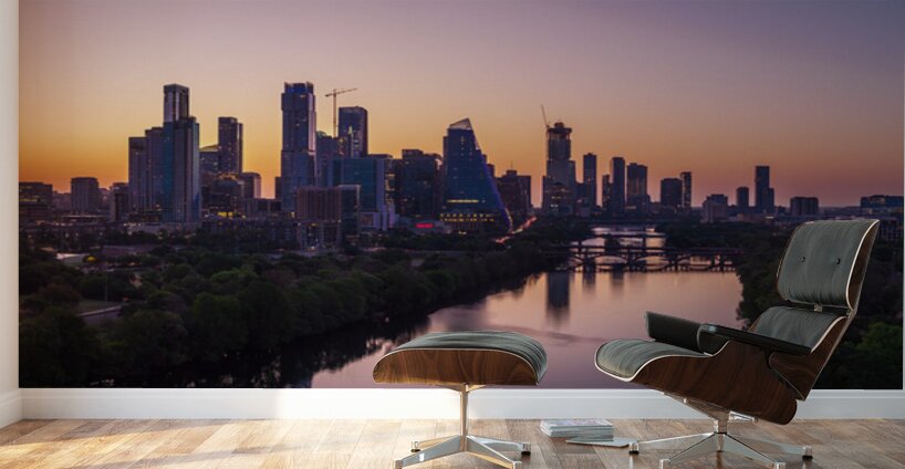 ABOUT THIS ARTWORK: ORANGE SKIES BEHIND SKYLINE OF AUSTIN TEXAS AS SUN STARTS TO RIS