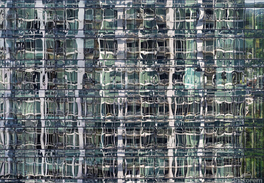 ABOUT THIS ARTWORK: REFLECTIONS OF CONDOMINIUM TOWER IN WINDOWS OF APARTMENT BUILDIN