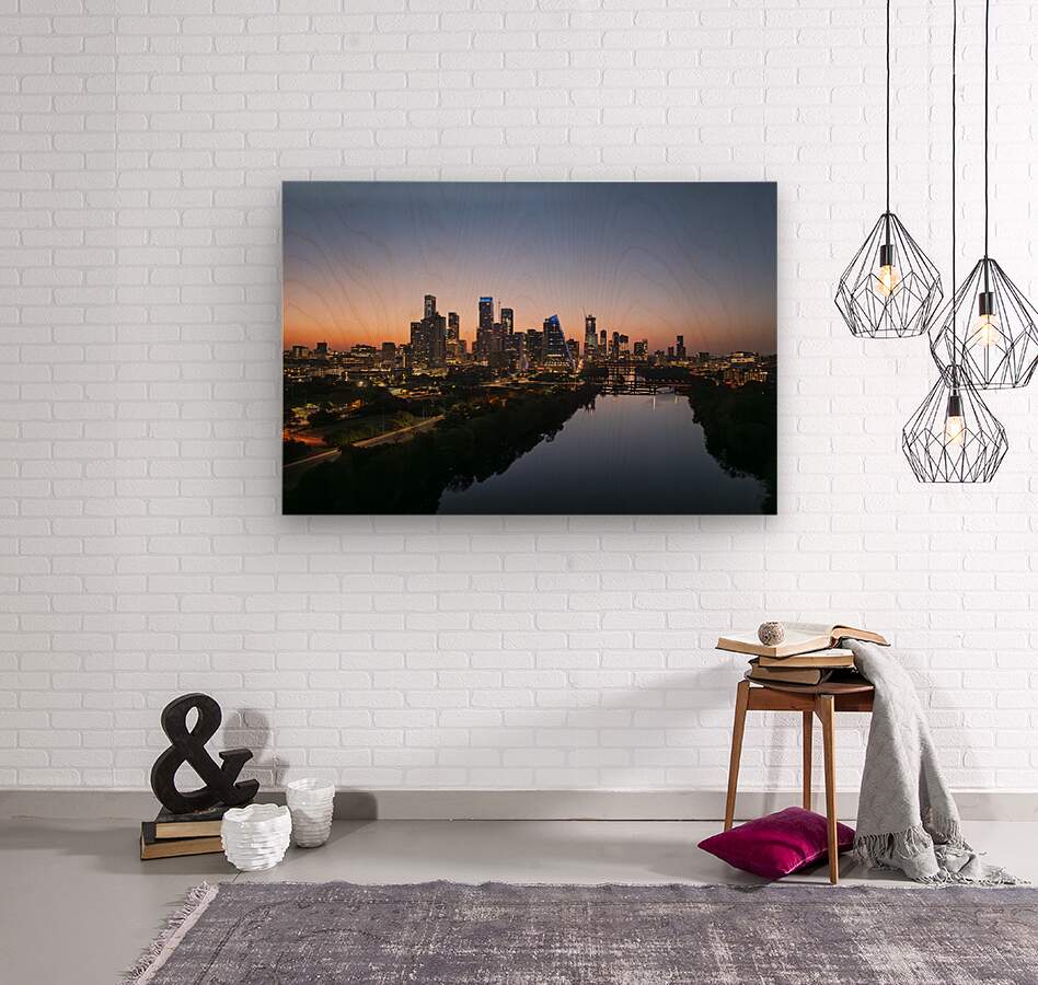 ABOUT THIS ARTWORK: ORANGE SKIES BEHIND SKYLINE OF AUSTIN TEXAS AS SUN STARTS TO RIS