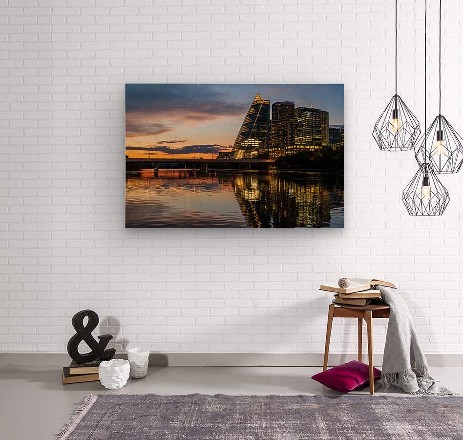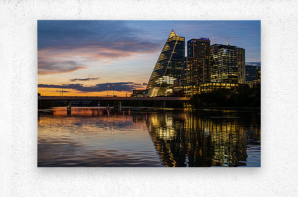 Dramatic sunset with illuminated city office blocks reflected in the golden waters of Lady Bird lake in Austin Texas