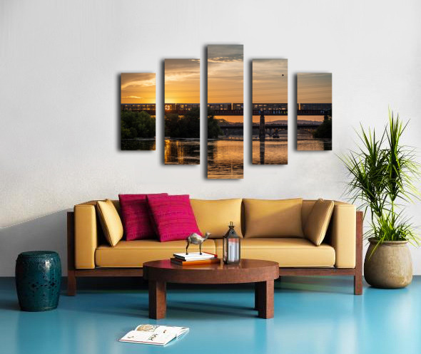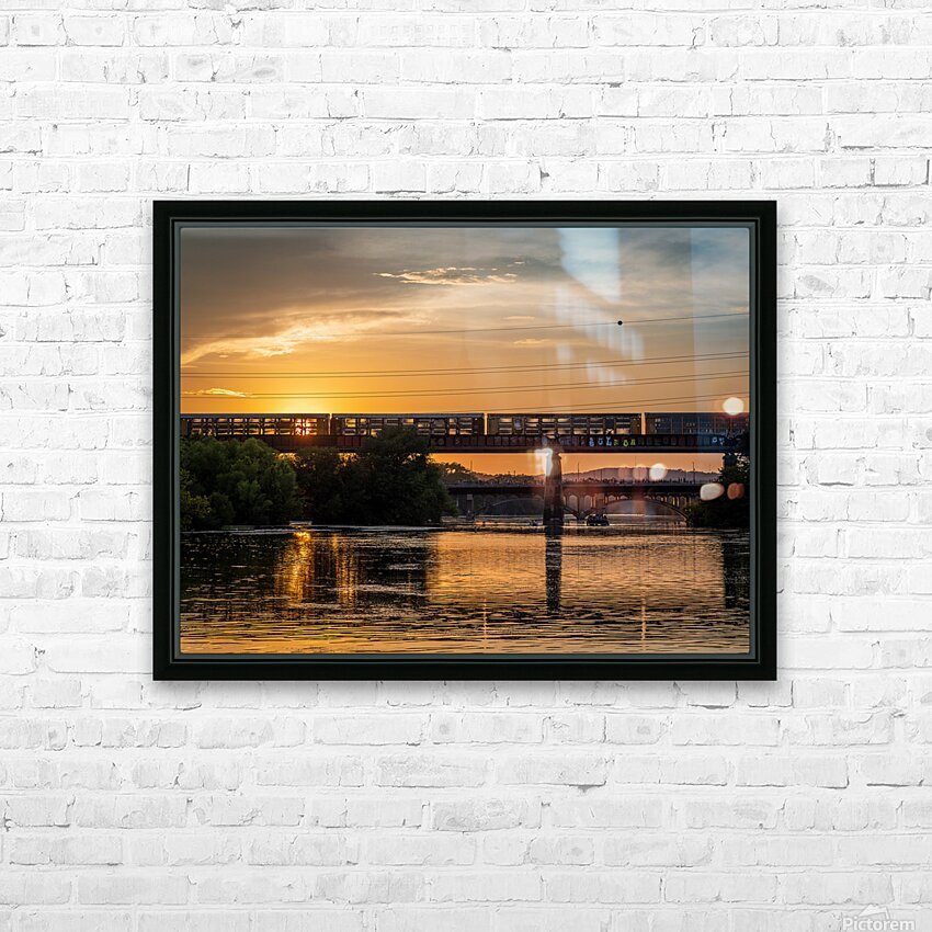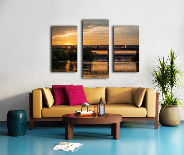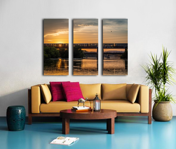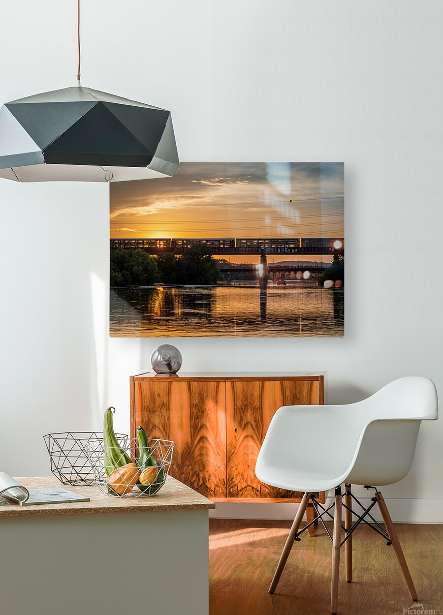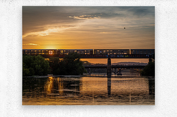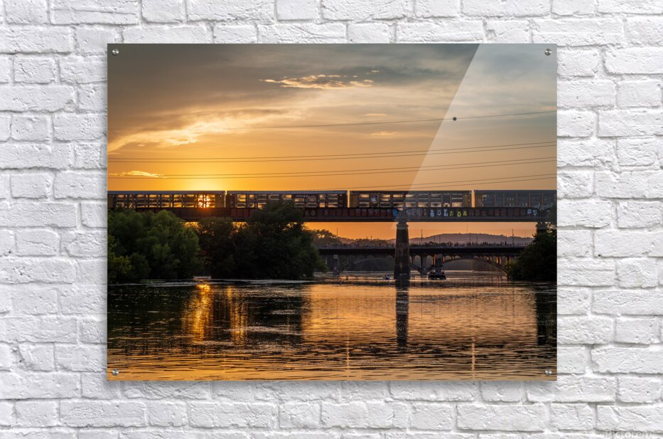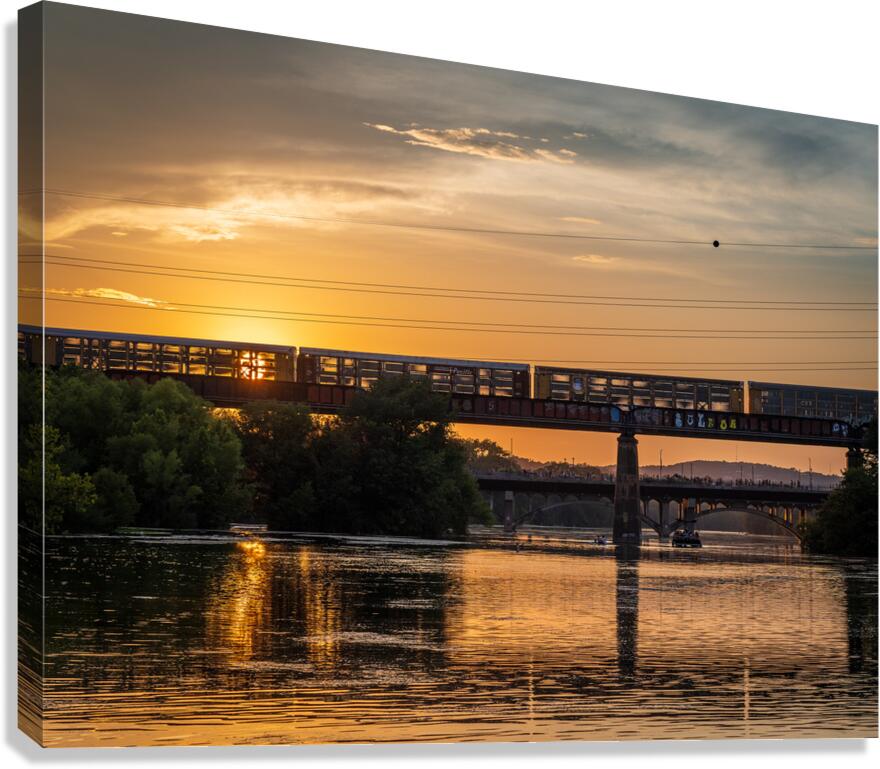 Get this artwork "Freight train on the railroad bridge in Austin at sunset" in a framed print.