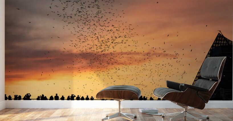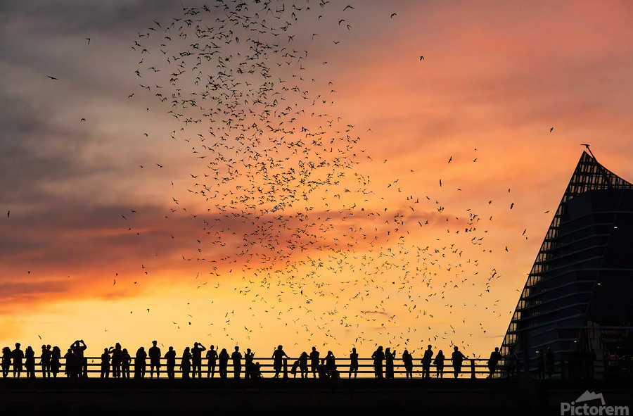 ABOUT THIS ARTWORK: BATS FLYING OVERHEAD - CROWD ON CONGRESS AVENUE BRIDGE