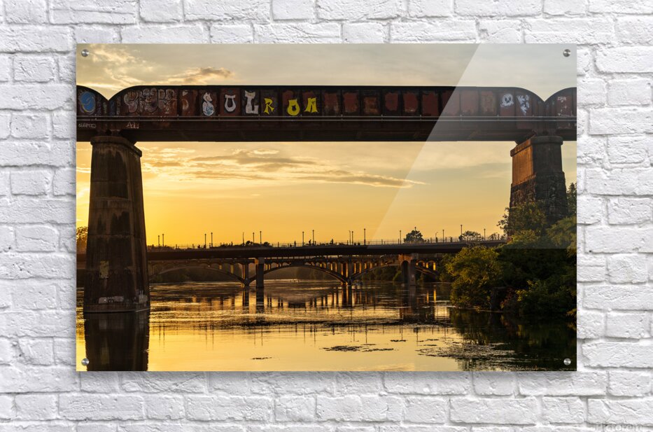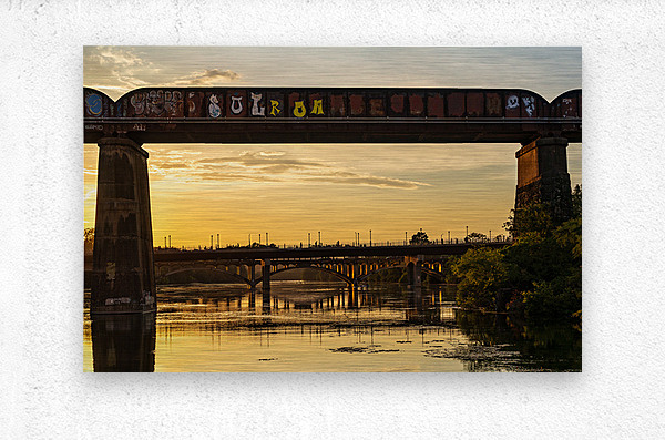 Get this artwork "Bridges behind the railroad bridge in Austin at sunset" in a framed print.