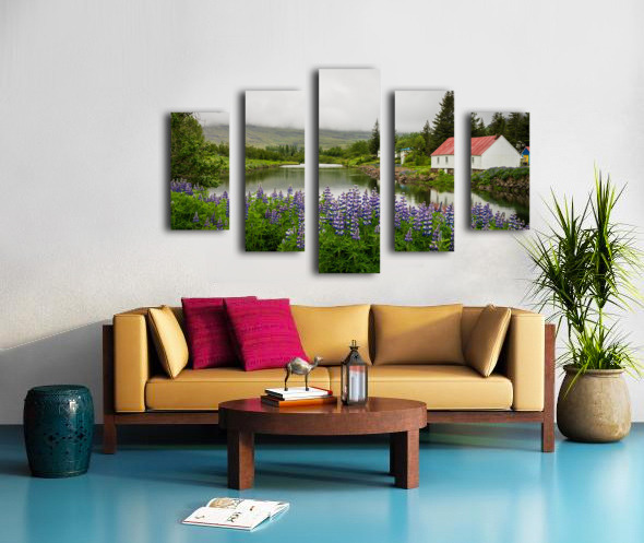 Peaceful scene in Seydisfjordur of calm river flowing from mist covered mountains past homes with Alaskan lupines in foreground