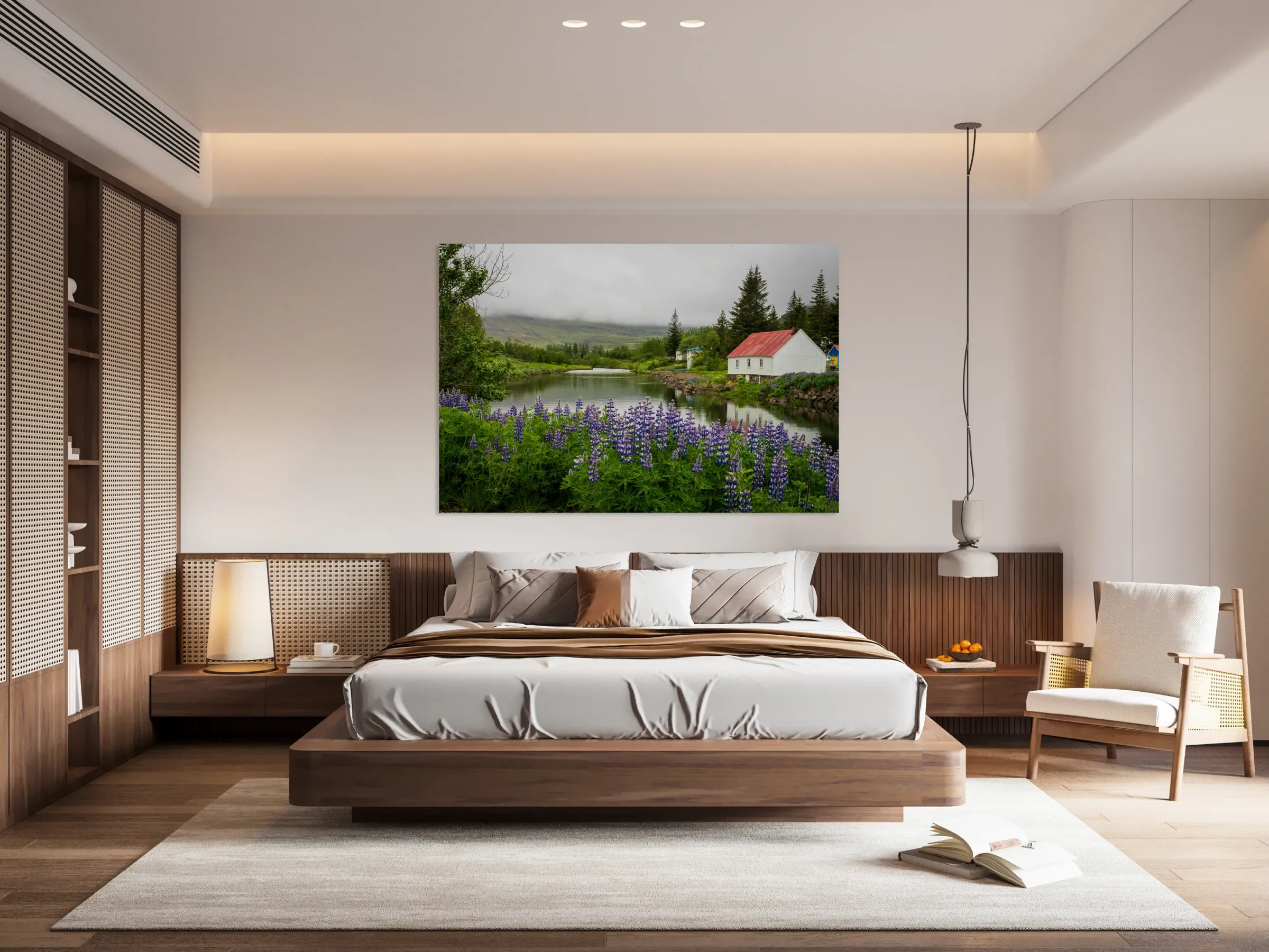 Peaceful scene in Seydisfjordur of calm river flowing from mist covered mountains past homes with Alaskan lupines in foreground