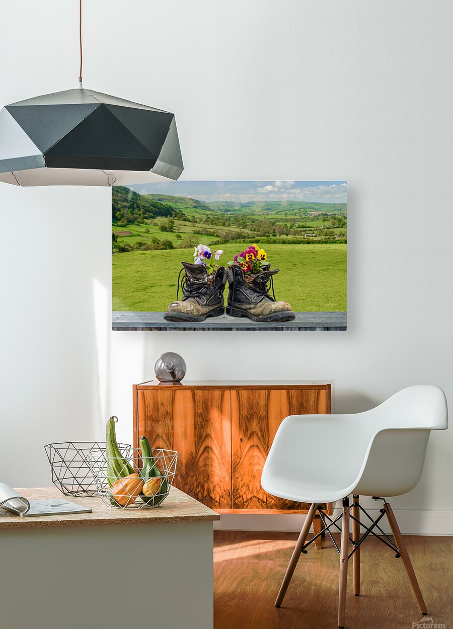 Get this artwork "Pair of old hiking boots turned into plant pots with hill walkin" in a framed print.
