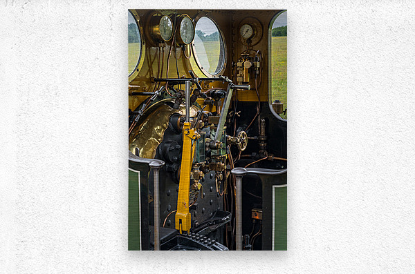 ABOUT THIS ARTWORK: DETAIL OF THE DRIVER CABIN AND CONTROLS ON AN OLD STEAM LOCOMOTI