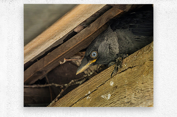 Head of a jackdaw poking out from nest in the rafters of an old  Picture Frame Printing
