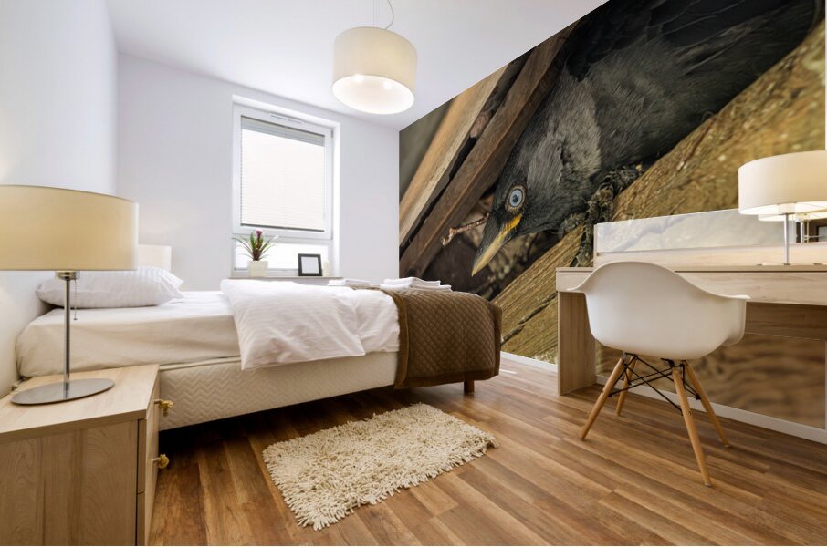 ABOUT THIS ARTWORK: HEAD OF A JACKDAW POKING OUT FROM NEST IN THE RAFTERS OF AN OLD