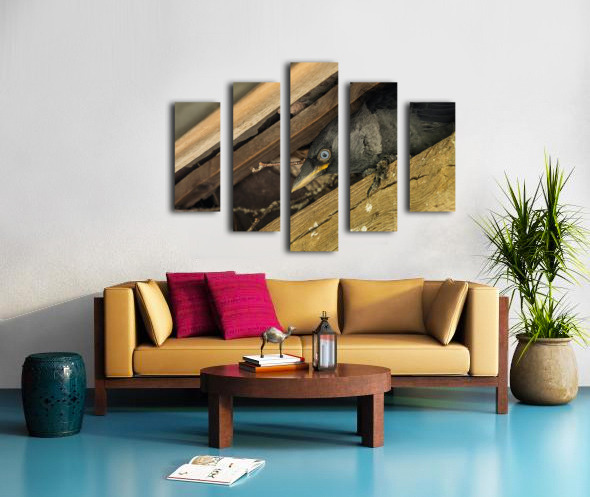 Head of a jackdaw poking out from nest in the rafters of an old  Canvas print
