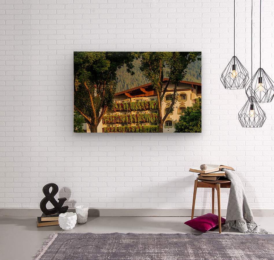 Get this artwork "Flower strewn balconies of a hotel in Alpine village of Leavenwo" in a framed print.