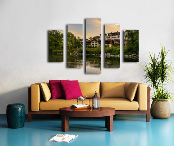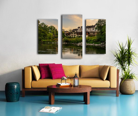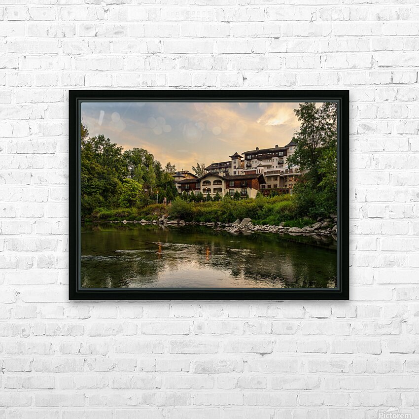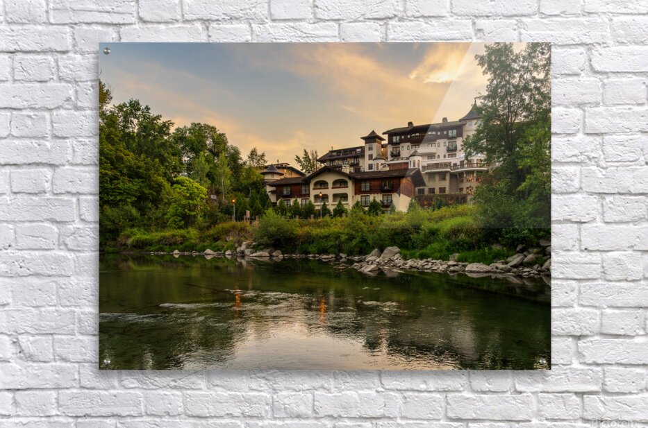 Get this artwork "Hotel at dawn by River Wenatchee in Alpine German town of Leaven" in a framed print.