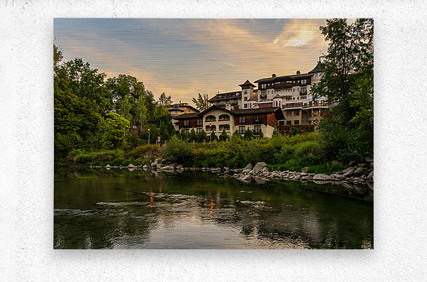 ABOUT THIS ARTWORK: HOTEL AT DAWN BY RIVER WENATCHEE IN ALPINE GERMAN TOWN OF LEAVEN