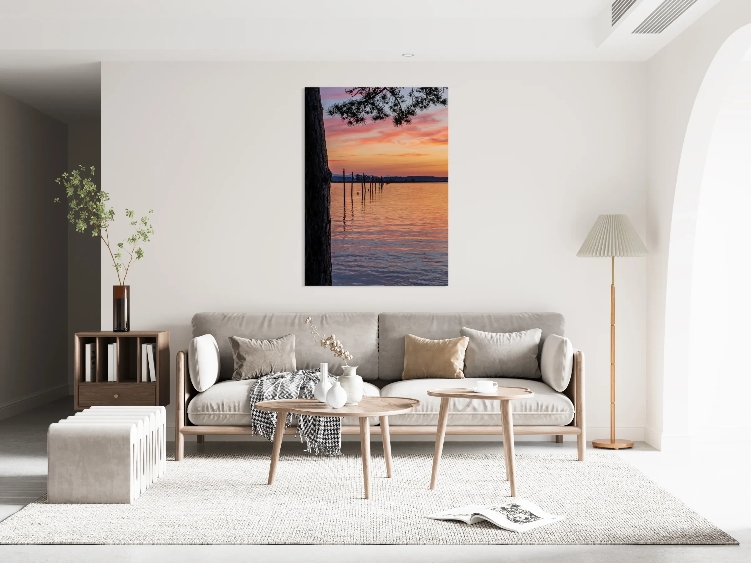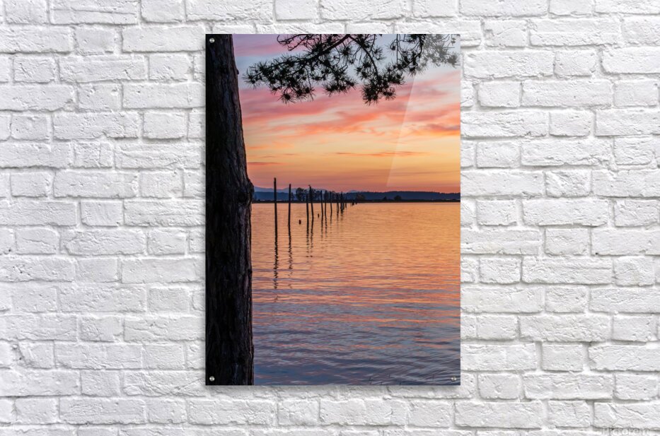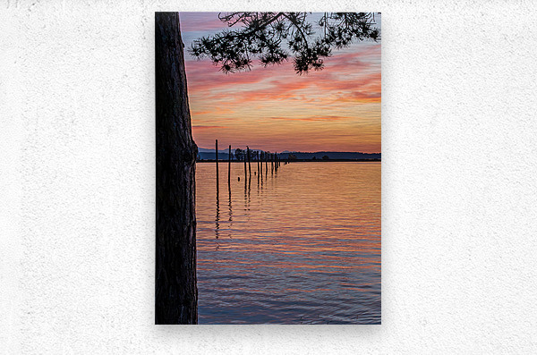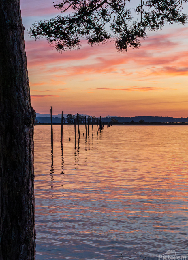Pine tree frames old wooden posts as leading line to sunset off Everett in Possession Sound Washington State