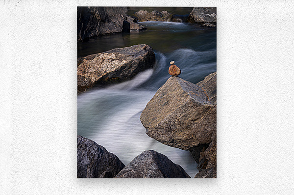 ABOUT THIS ARTWORK: PEBBLES BALANCED ON ROCKS IN RAGING RIVER ILLUSTRATING RESILIENC