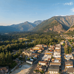 Aerial drone view of Leavenworth the Bavarian Alpine village in Cascade Mountains of Washington State at dawn