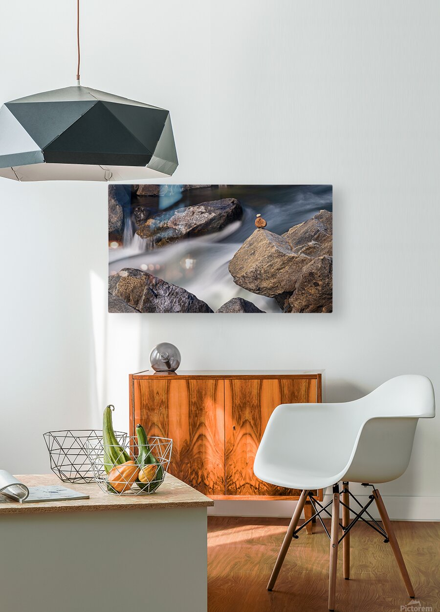 ABOUT THIS ARTWORK: PEBBLES BALANCED ON ROCKS IN RAGING RIVER ILLUSTRATING RESILIENC
