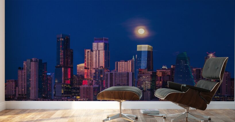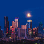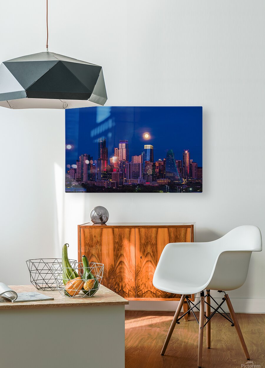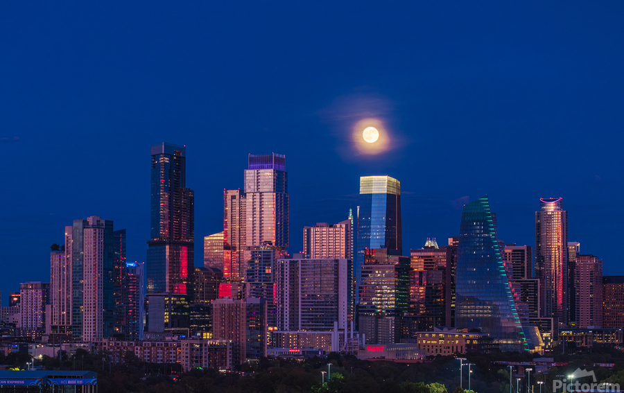 ABOUT THIS ARTWORK: HARVEST MOON IN THE AUSTIN SKYLINE AT SUNSET IN TEXAS