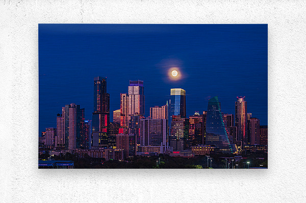 Exclusive fine art photography print ready to hang, capturing aerial view of the harvest moon rising above Austin Texas skyline as the full harvest moon is seen rising by the office buildings. Zilker Park in the foreground.