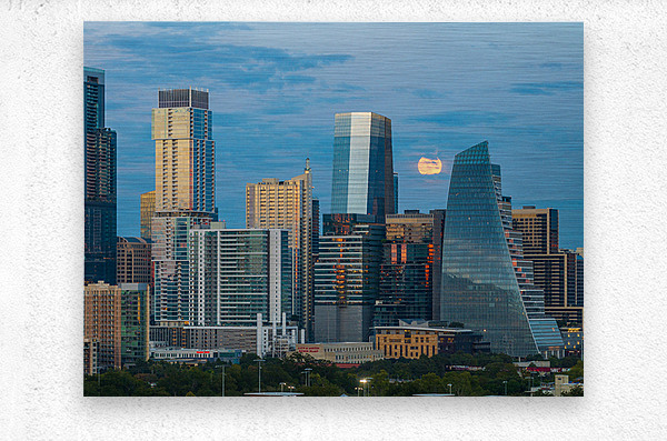 Get this artwork "Harvest moon by Google building in Austin skyline Texas" in a framed print.