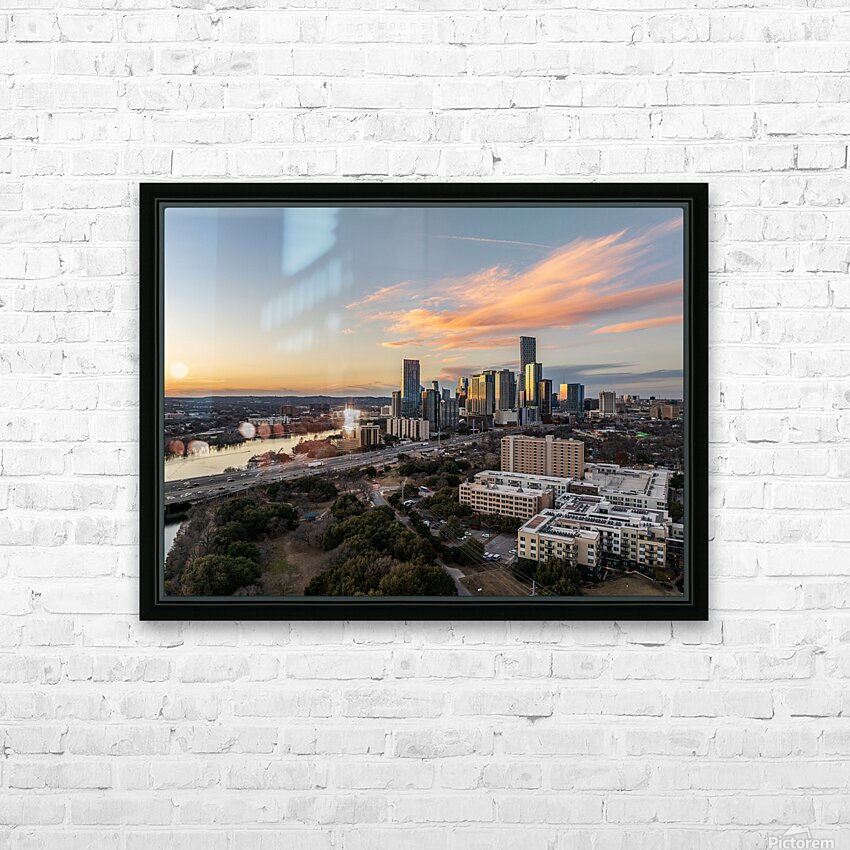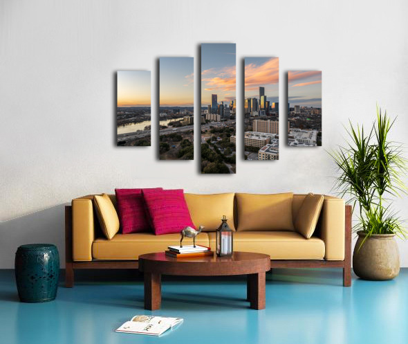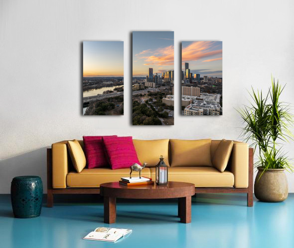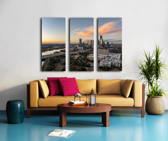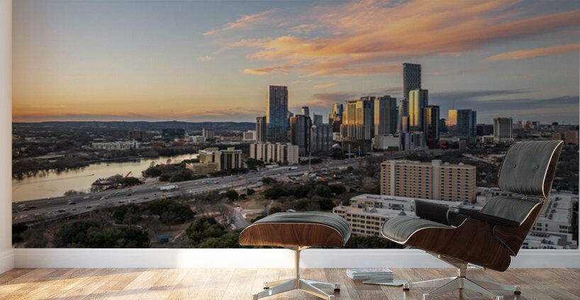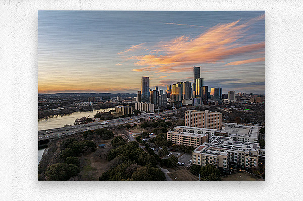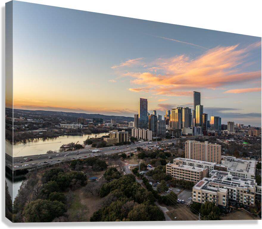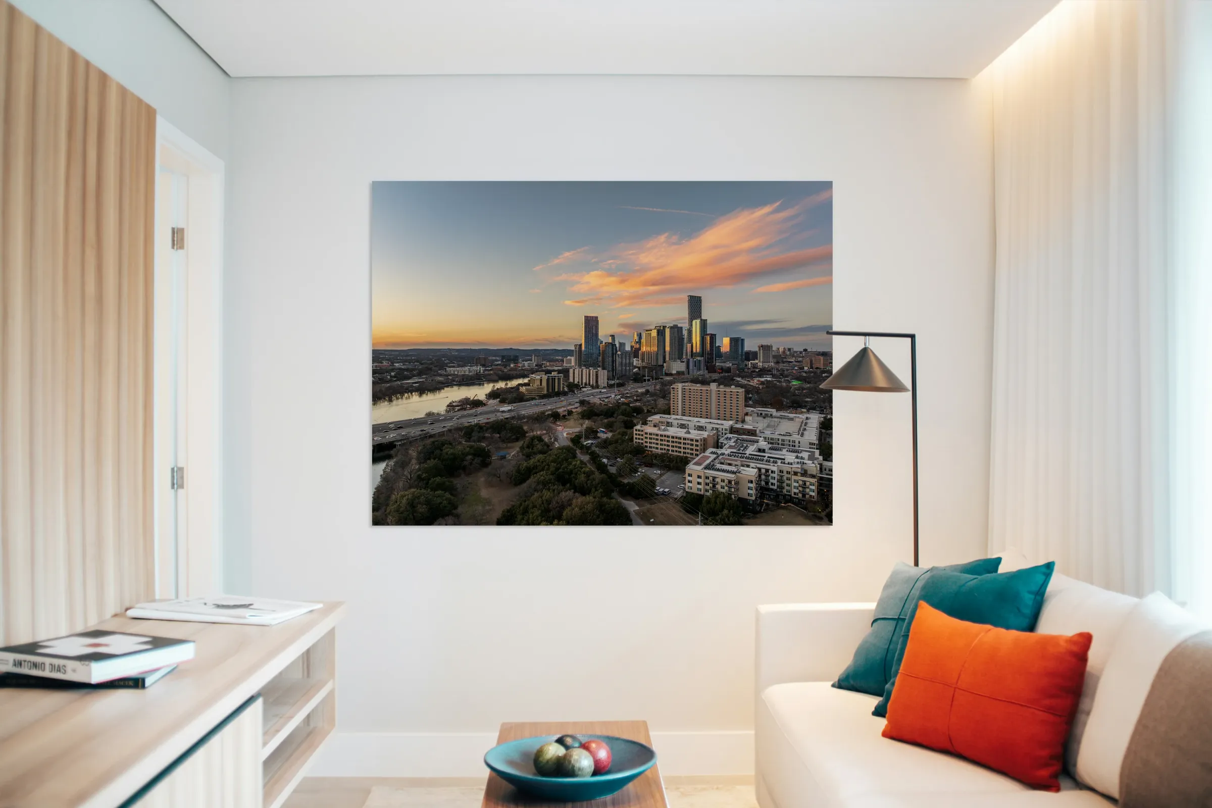 Premium high-resolution wall art print featuring aerial view of sunset over the dramatic skyline of Austin Texas in early 2026 showing new residential towers in downtown