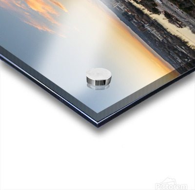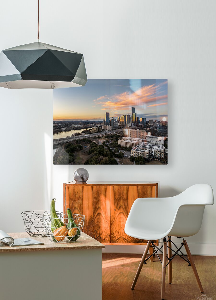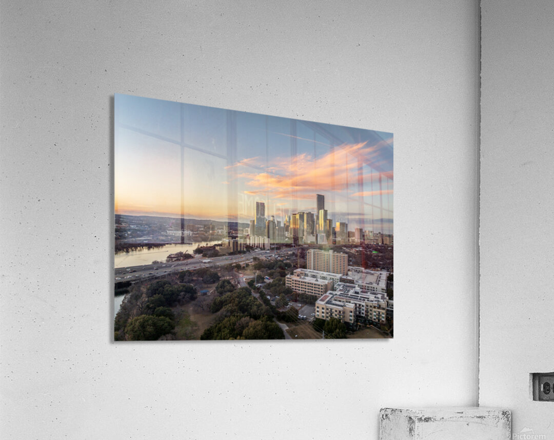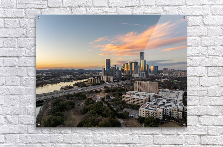 Premium high-resolution wall art print featuring aerial view of sunset over the dramatic skyline of Austin Texas in early 2026 showing new residential...[+]