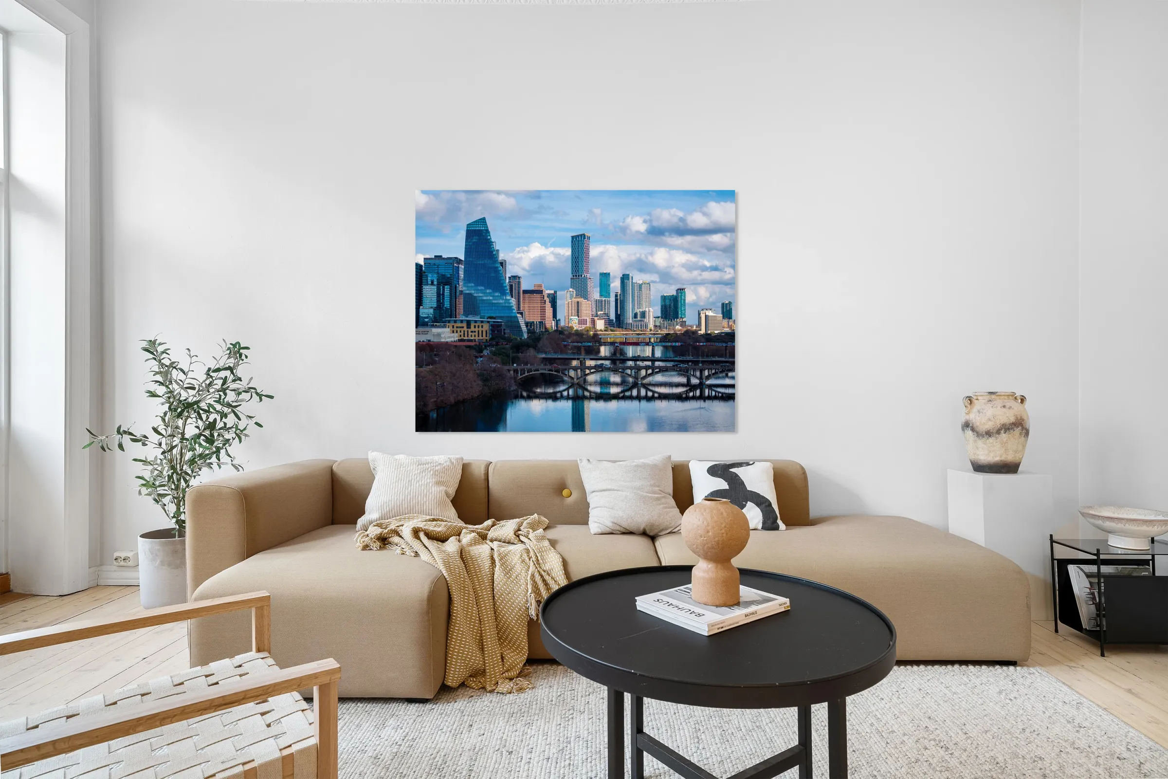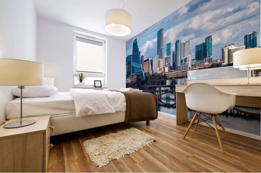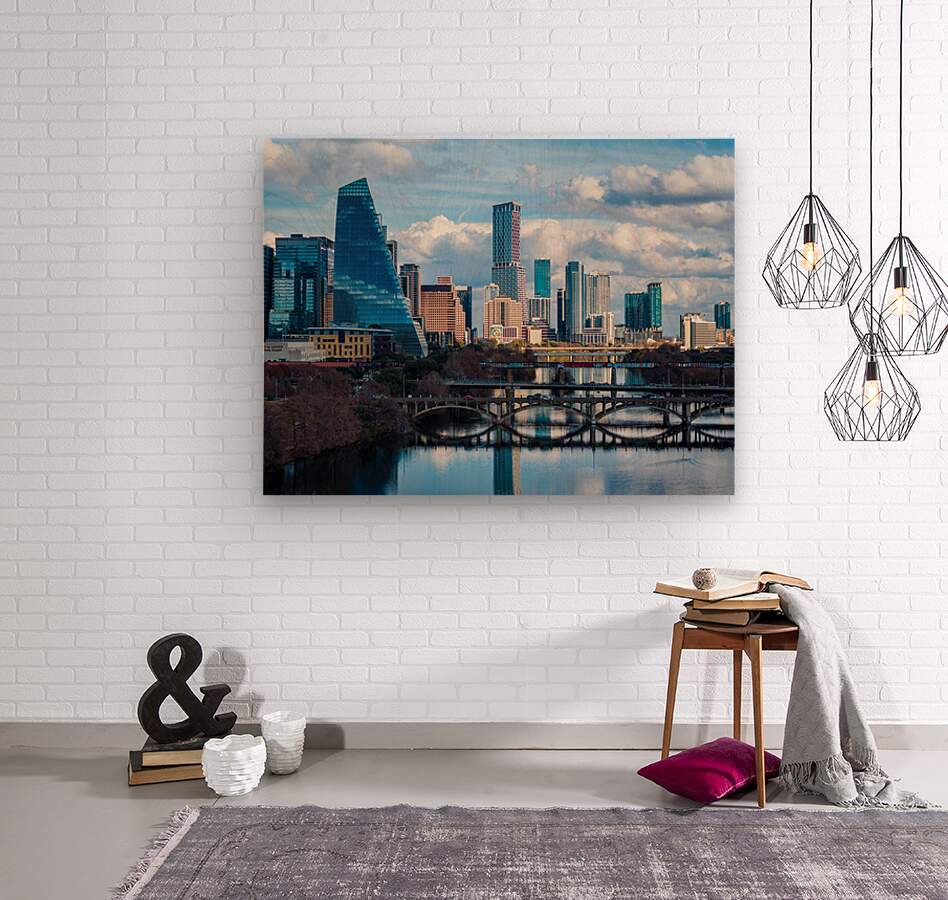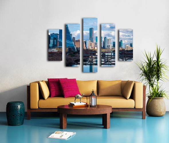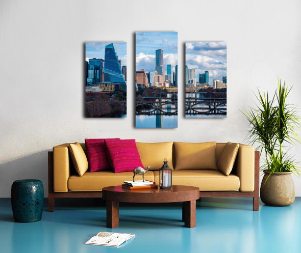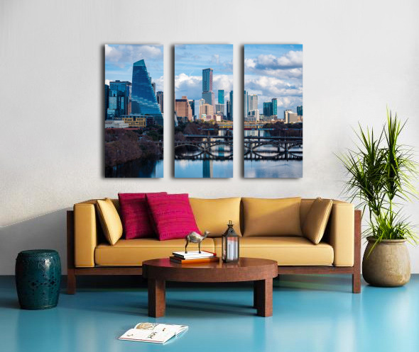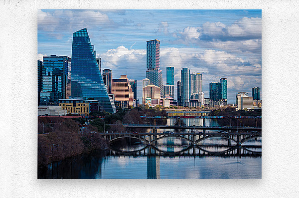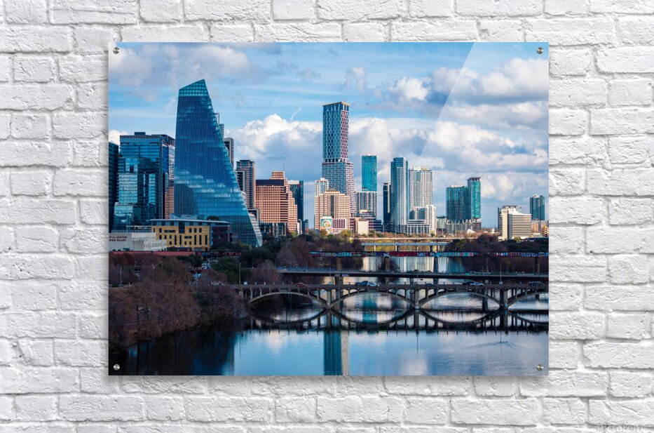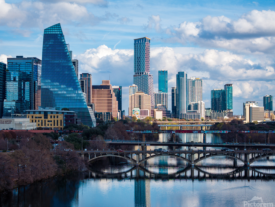 Stunning home decor print showcasing a detailed close-up of the Austin downtown skyline the Google Sail building and the river bridge. A crisp high-resolution view of the Texas capital city from the west highlighting the modern architecture and the peaceful reflection of the city in the waters of the Colorado River.
