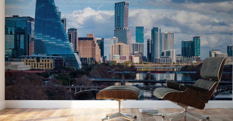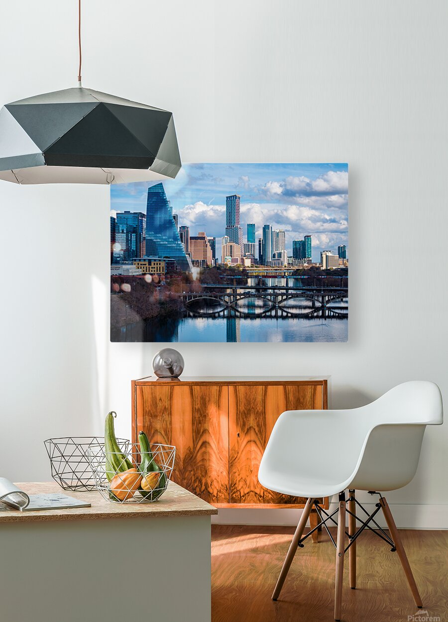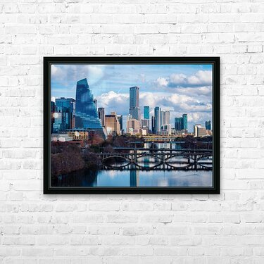 Stunning home decor print showcasing a detailed close-up of the Austin downtown skyline the Google Sail building and the river bridge. A crisp high-re...[+]