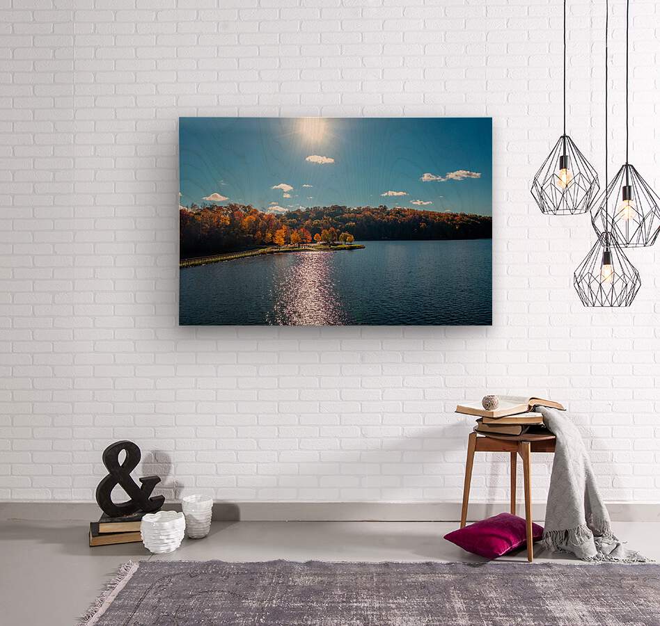 Get this artwork "Sunburst above fall trees around the water at Cheat Lake Park" in a framed print.