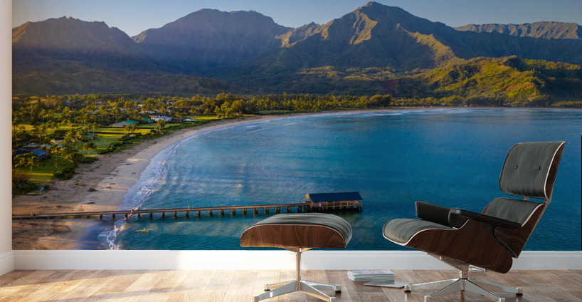 Aerial panoramic image at sunrise off the coast over Hanalei Bay and pier on Hawaiian island of Kauai