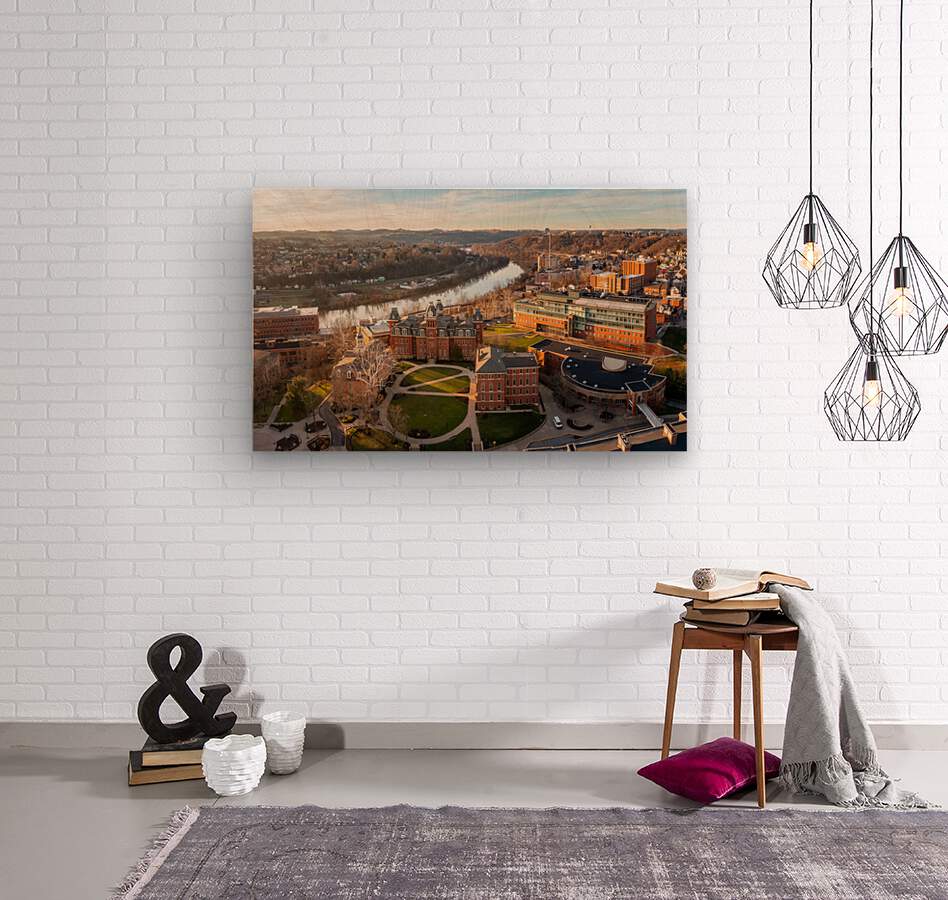 Aerial drone panoramic shot of the downtown campus of WVU in Morgantown West Virginia showing the river in the distance