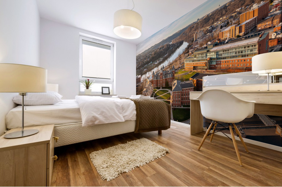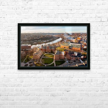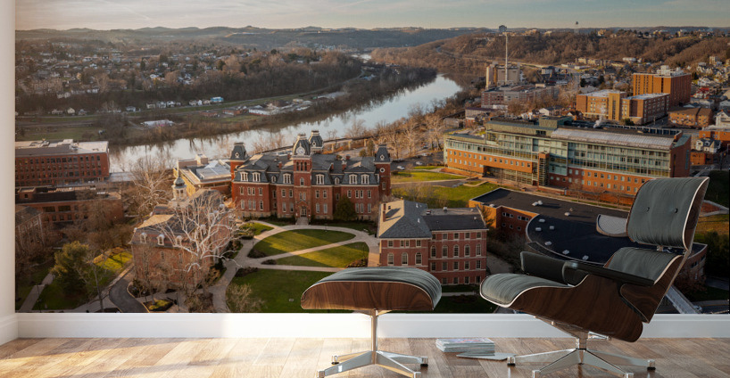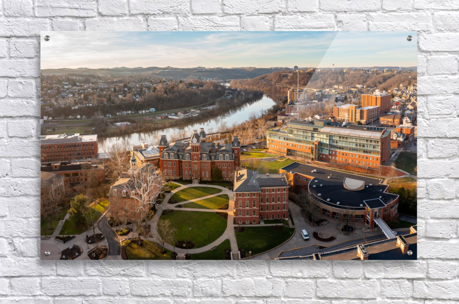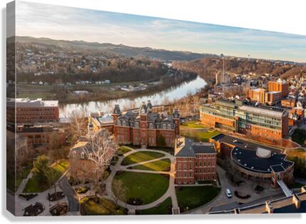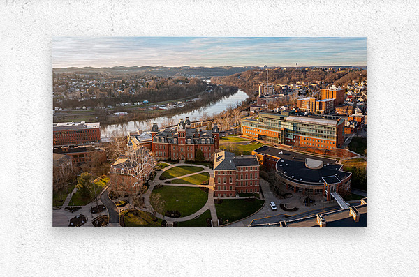 Aerial drone panoramic shot of the downtown campus of WVU in Morgantown West Virginia showing the river in the distance
