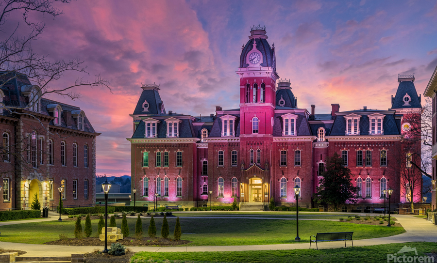 Dramatic image of Woodburn Hall at West Virginia University or WVU in Morgantown WV as the sun sets behind the illuminated historic building