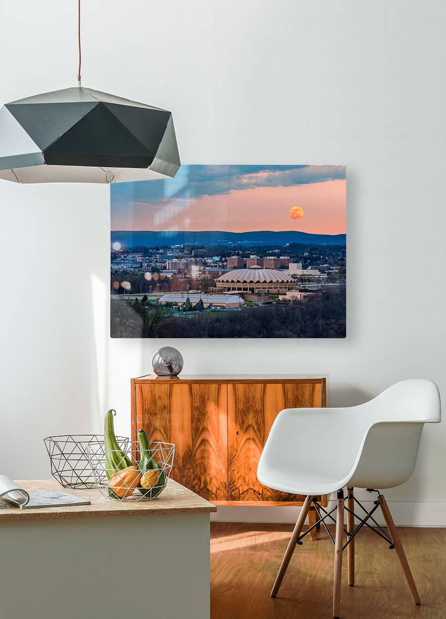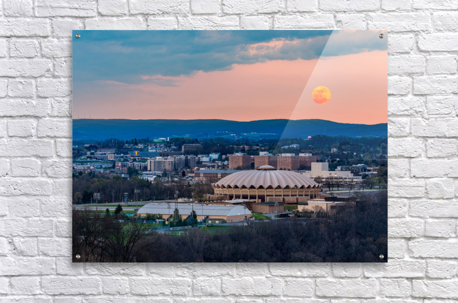 Get this artwork "Super pink moon rises above the WVU coliseum on Evansdale campus" in a framed print.
