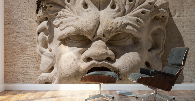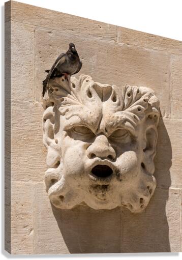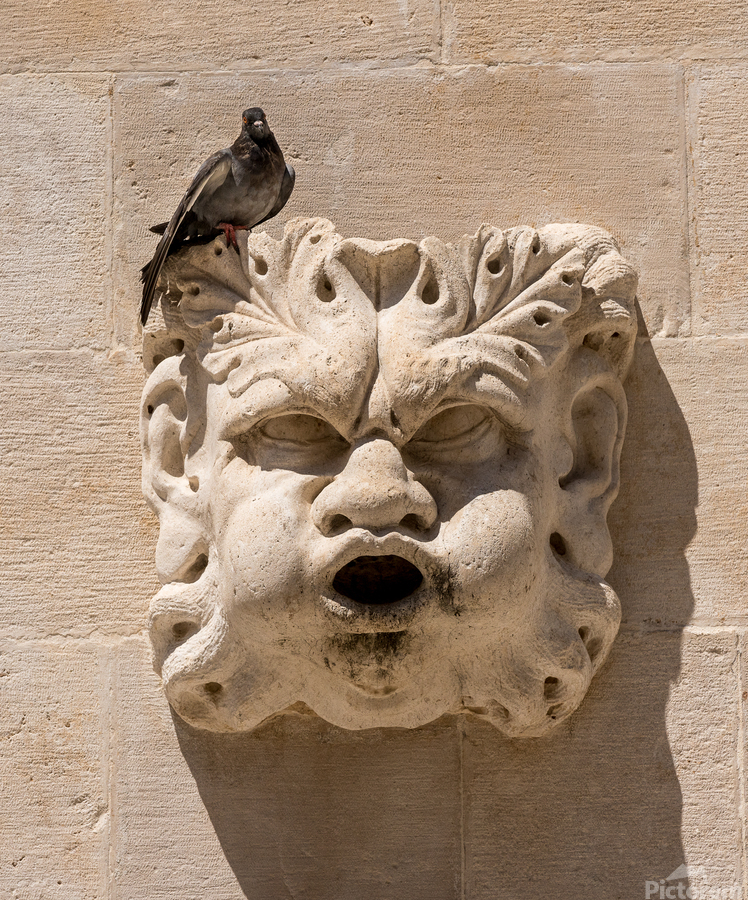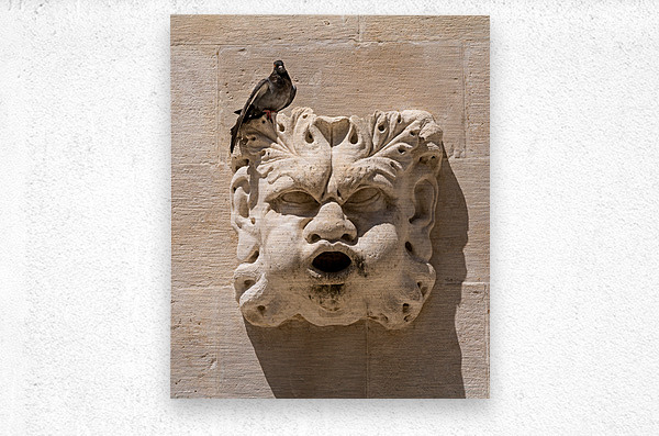 Pigeon sitting on carved face of rainwater spout in the old town of Dubrovnik in Croatia