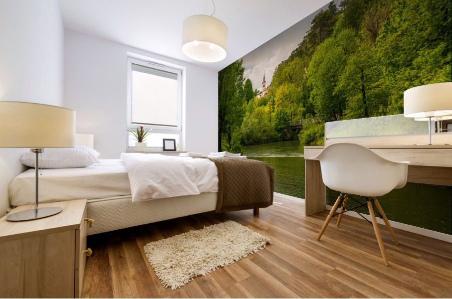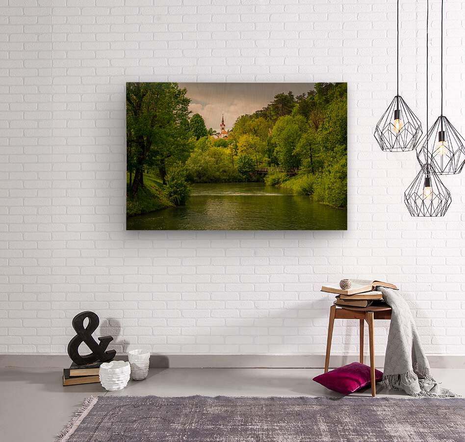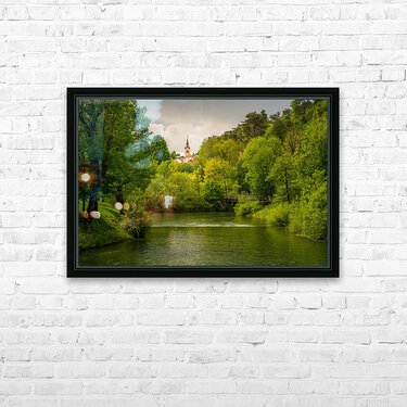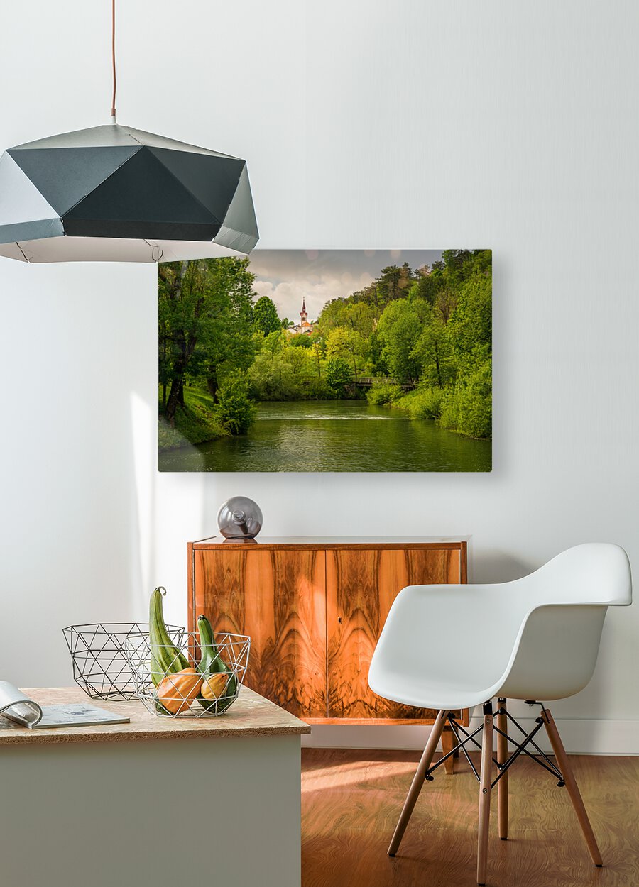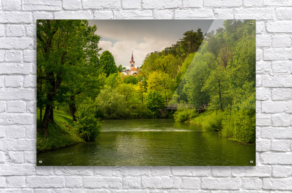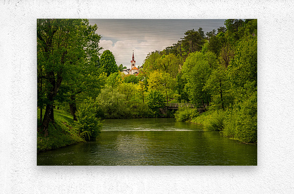 Get this artwork "Church in the woods above peaceful river" in a framed print.