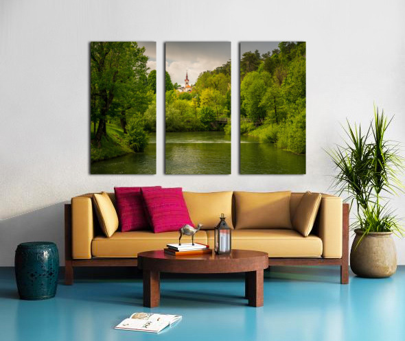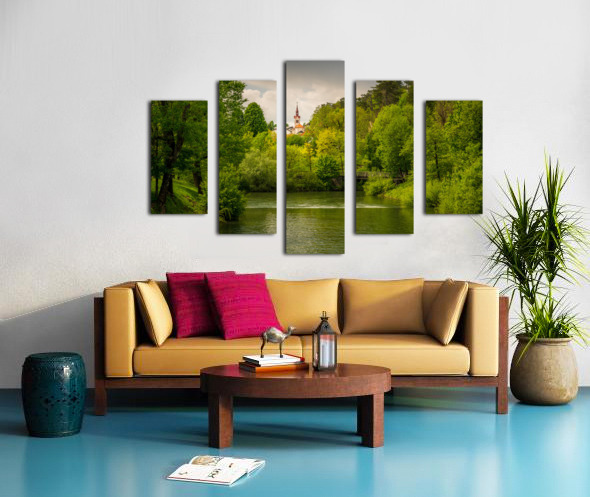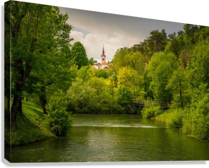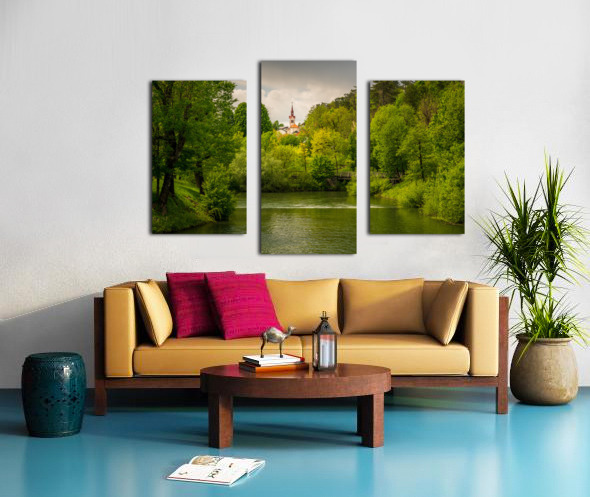 Church in the woods above peaceful river Canvas print