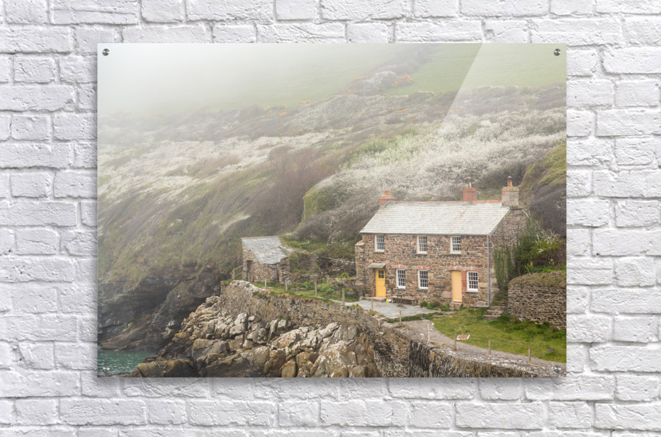 View of stone cottage and hillside as the mists roll in over the ocean in Port Quin Cornwall England UK
