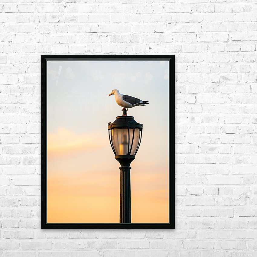 Seagull on a cast iron street lamp at dusk Picture Frame Printing