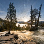 Sunrise at Emerald Bay on Lake Tahoe from the top of Lower Eagle Falls as the torrent of water from snow melt flows into the lake from Sierra Nevada Mountains