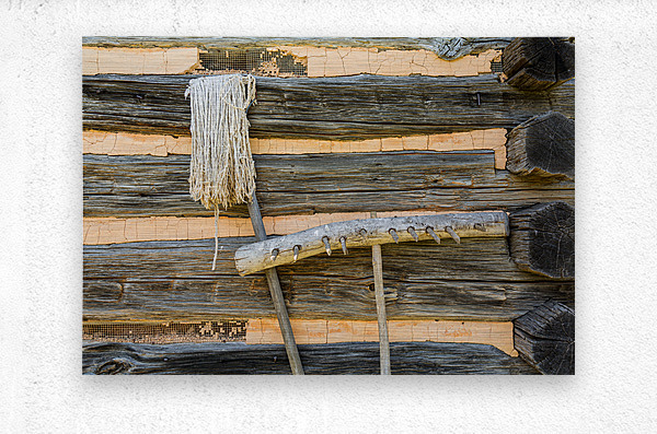 ABOUT THIS ARTWORK: OLD RAKE AND MOP AGAINST LOG CABIN