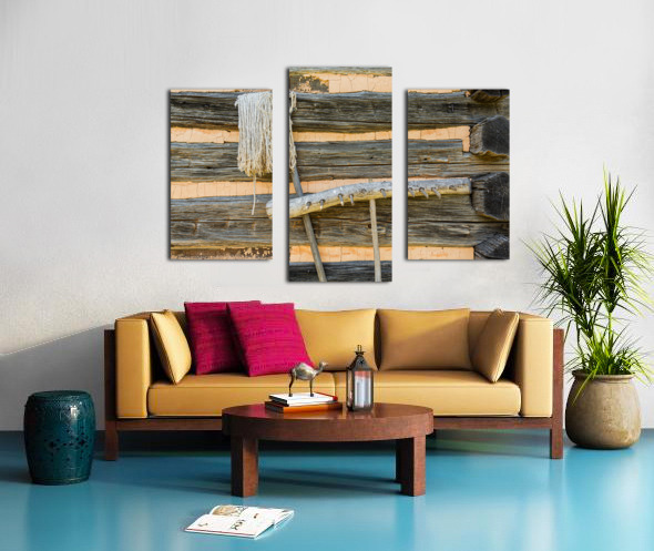 Old rake and mop against log cabin Canvas print