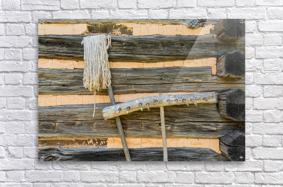 Get this artwork "Old rake and mop against log cabin" in a framed print.