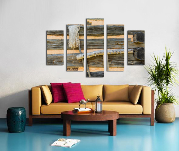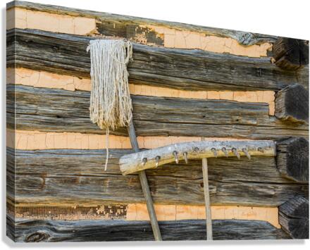 Old rake and mop against log cabin Canvas print