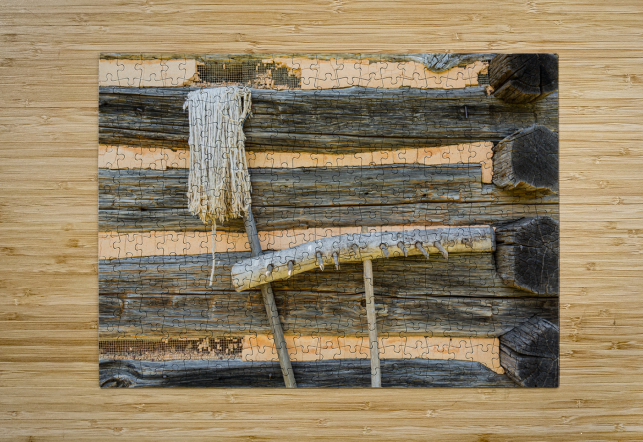 Old rake and mop against log cabin Steve Heap Puzzle printing